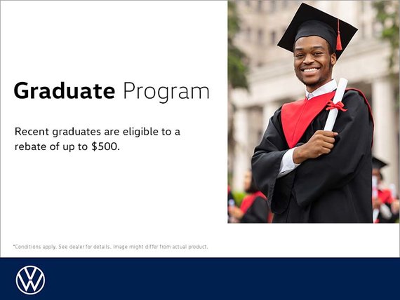 With our Graduate Program, recent graduates are eligible for a rebate of up to $500 on a new or certified pre-owned Volkswagen vehicle. Benefit from lower payments and flexibility!